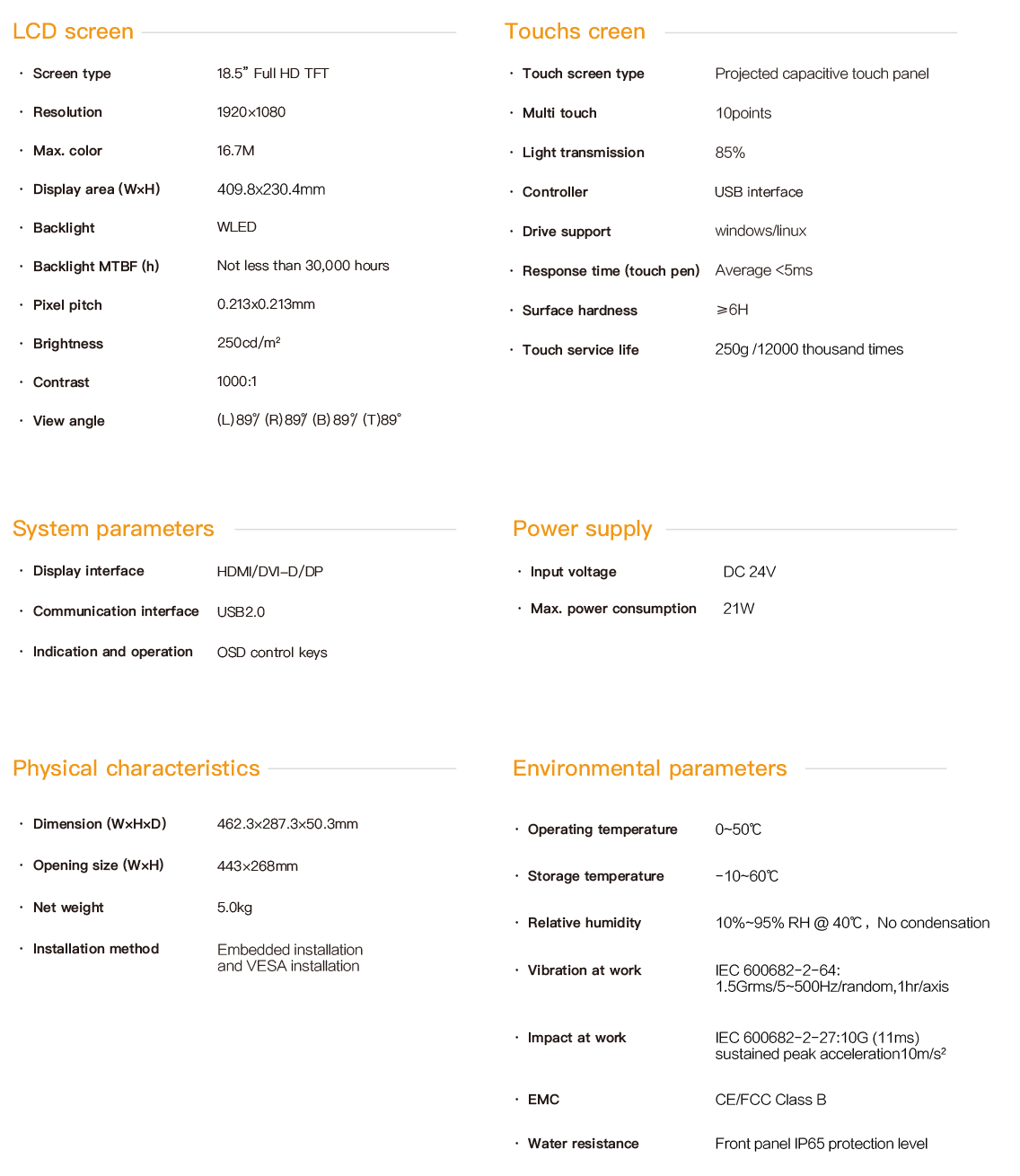 PD-8818 is an embedded ultra-thin industrial touch panel. It is equipped with a 18.5 "high-definition LCD screen with a resolution of 1920×1080 and a projected multi-point capacitive touch screen. It supports three signal transmission interfaces: HDMI, DVI and DP, as well as multiple USB interface expansions. The maximum communication distance between the PC and the touch panel can reach 30 meters, and the entire machine is powered by DC 24V. The front panel has an IP65 protection rating. All interfaces are designed with fastening and have passed CE/FCC certification, making it suitable for demanding human-machine interaction industrial sites.