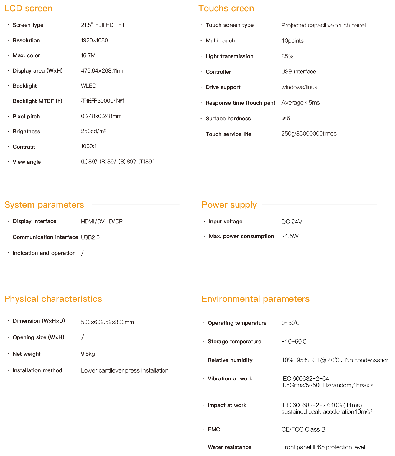 The PDX-3721 is an industrial touch panel with a lower cantilever mounting. It features vertical screen display and is equipped with a keyboard stand. It is configured with a 21.5 "high-definition LCD screen with a resolution of 1920x1080 and a projected multi-touch capacitive screen. It supports three signal transmission interfaces: HDMI, DVI and DP, as well as multiple USB2.0 interface expansions. The maximum communication distance between the PC and the touch panel can reach 30 meters, and the entire machine is powered by DC24V. The front panel has an IP65 protection rating. All interfaces are designed with fastening and have passed CE/FCC certification, making it suitable for demanding human-machine interaction industrial sites.