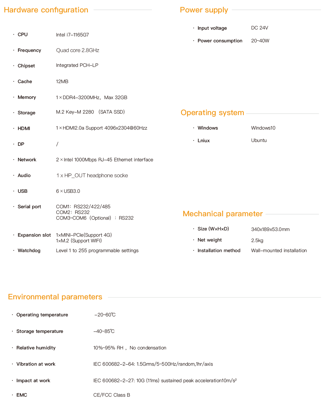 EPC-2872 is a fanless industrial computer based on the high-performance Intel?Intel Core i7-1165G7 processor. The product supports HDMI display interface and is equipped with a rich array of I/O interfaces, including 2 Intel GBE gigabit network ports. 6 USB3.0 ports and 4 optional USB2.0 ports. 1 RS232/RS422/RS485,1 RS232,4 optional RS232 serial ports. One 1× mini-CLE expansion slot for expanding 3G/4G modules, one ×M.2 expansion slot for expanding wireless WIFI, one M.2 hard disk interface for supporting SATA protocol SSD. The system IO interface is equipped with an EMC circuit to ensure the reliability of the product and a lower failure rate. The product features an exquisite and robust design. The large area of aluminum fins quickly dissipates the heat from the processor. The fanless and fully enclosed structure effectively prevents dust from entering, ensuring the product operates reliably for a long time in harsh industrial environments. The whole machine is powered by DC12V to 24V. All interfaces are designed with fastening and have passed CE/FCC certification. It can be applied to harsh industrial sites, and the operating system supports Windows10 and Linux.