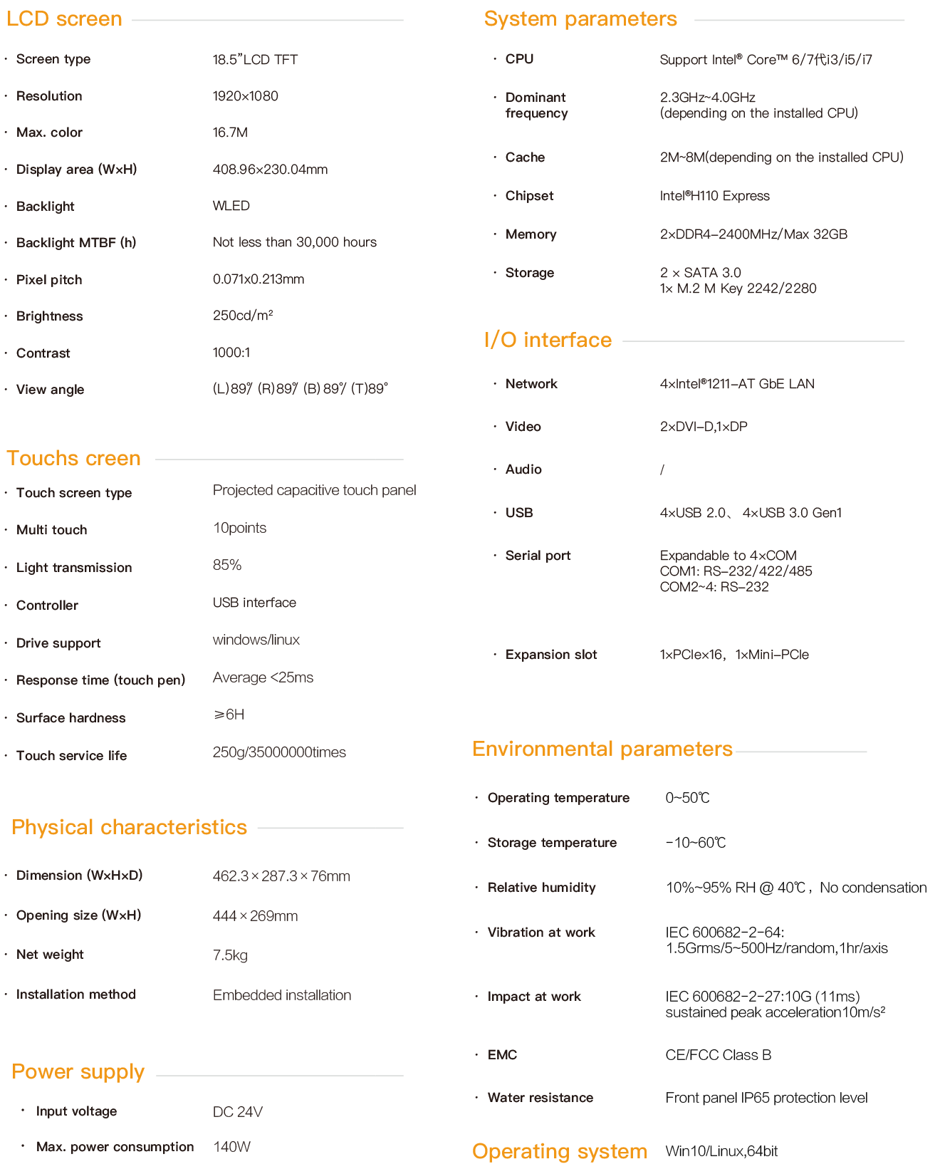 The HPC-9618 is an industrial capacitive touch tablet computer that combines industrial display and touch screen technology. The product has a compact structure, is easy to install and operate, and is a high-performance and highly reliable industrial computer system. The whole machine adopts an 18.5-inch high-definition LCD screen with a resolution of 1920*1080, featuring rich and fine colors and a wide viewing Angle. It is powered by 24V DC and adopts a projected 10-point capacitive screen. The main unit is equipped with an Intel Core 6th / 7th generation CPU. Configurable large-capacity solid-state SSD, with memory support up to 32G capacity. The HPC-9618 supports hook-type embedded installation. The front panel complies with the IP65 water and dust resistance standard, preventing water splashes from entering during installation in the control cabinet. The high-strength all-steel box structure features shock resistance and vibration protection functions. Especially, the specialized EMC design enables the entire machine to have excellent anti-interference ability and be able to adapt to the harsh working environment in industrial sites. It is widely applied in industrial sites with strong interference such as factory automation, mechanical manufacturing, numerical control equipment, textile equipment, communication networks and power automation.