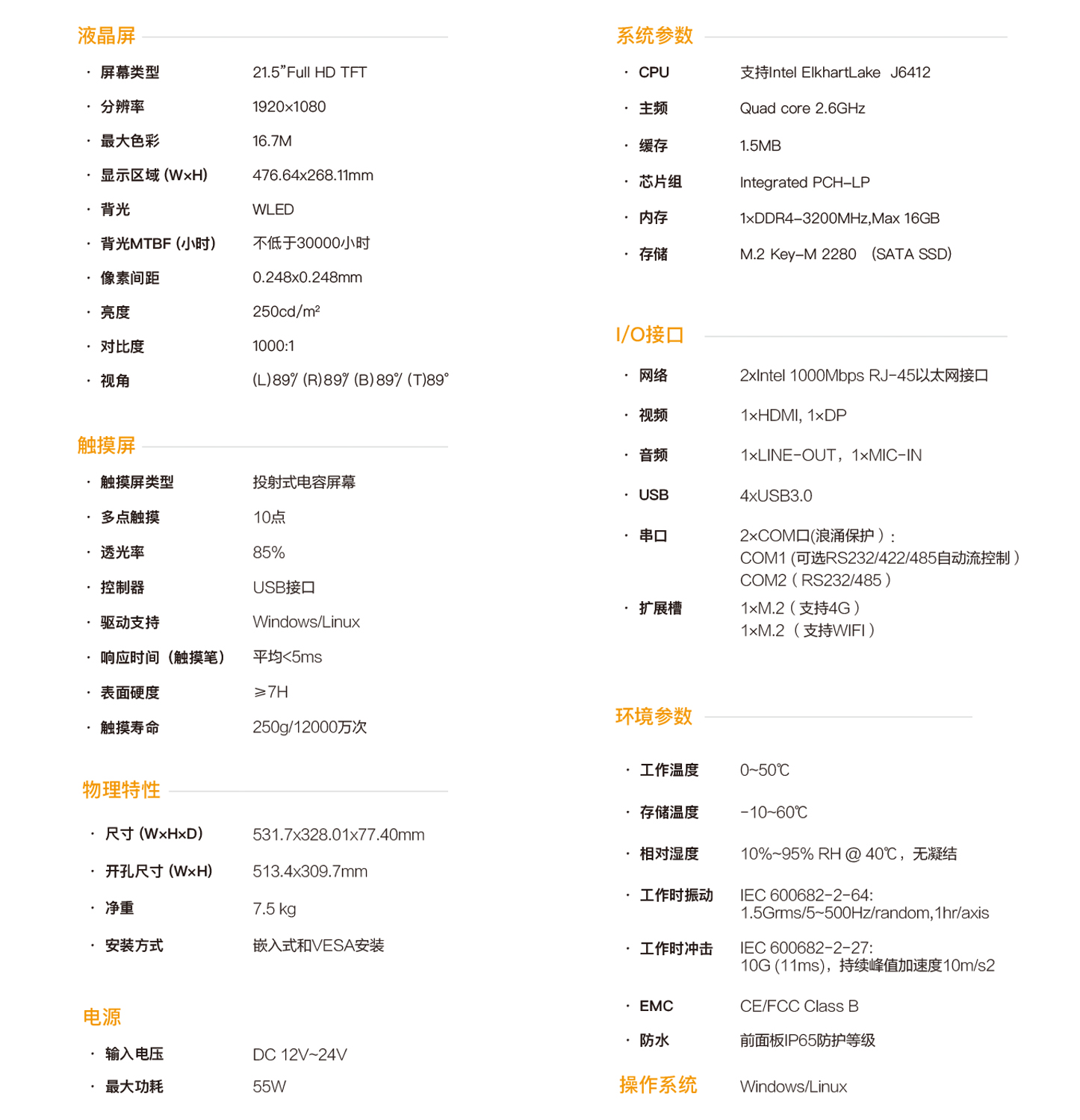 TPC-5621是一款嵌入式工業(yè)型電容觸控平板電腦,采用無(wú)風(fēng)扇靜音設(shè)計(jì),產(chǎn)品構(gòu)成緊湊、易于安裝、操控方便。整機(jī)采用21.5寸分辨率為1920x1080的高清液晶顯示屏,觸控采用多點(diǎn)投射式電容屏。主機(jī)部分基于Intel ElkhartLake處理平臺(tái)CPU,采用J6412處理器。支持多種安裝方式,專門的EMC設(shè)計(jì)使得機(jī)器能夠適應(yīng)工業(yè)現(xiàn)場(chǎng)惡劣的工作環(huán)境,廣泛應(yīng)用于各種強(qiáng)干擾工業(yè)場(chǎng)合。