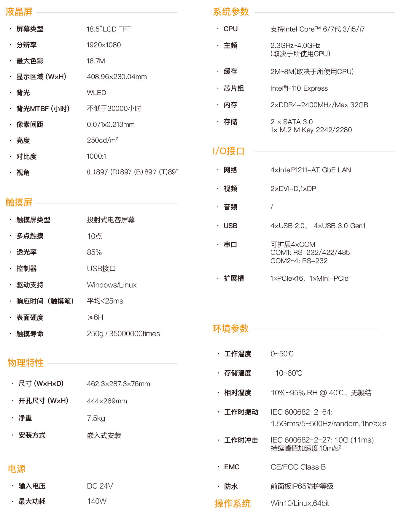 HPC-9618是一款工業(yè)型電容觸控平板電腦,將工業(yè)顯示和觸摸屏技術(shù)相結(jié)合,產(chǎn)品結(jié)構(gòu)緊湊、易于安裝、操控方便,是一款高效能、高可靠的工業(yè)電腦系統(tǒng), 整機(jī)采用18.5寸分辨率為1920*1080的高清液晶顯示屏,色彩豐富細(xì)膩,視角寬闊,24V直流供電,采用投射式10點(diǎn)電容屏,主機(jī)部分搭載Intel Core 6/7代CPU,可配置大容量固態(tài)SSD,內(nèi)存支持最大32G容量。 HPC-9618支持掛鉤式嵌入式安裝,前面板符合IP65防水防塵標(biāo)準(zhǔn),杜絕安裝在控制柜時(shí)因現(xiàn)場(chǎng)飛濺的水滴進(jìn)入,高強(qiáng)度全鋼型箱體結(jié)構(gòu),具有抗沖擊和振動(dòng)防護(hù)功能,尤其是專門的EMC設(shè)計(jì)使得整機(jī)具有優(yōu)秀的抗干擾能力,能夠適應(yīng)工業(yè)現(xiàn)場(chǎng)惡劣的工作環(huán)境,廣泛應(yīng)用于工廠自動(dòng)化、機(jī)械制造、數(shù)控設(shè)備、紡織設(shè)備、通訊網(wǎng)絡(luò)以及電力自動(dòng)化等強(qiáng)干擾的工業(yè)現(xiàn)場(chǎng)。