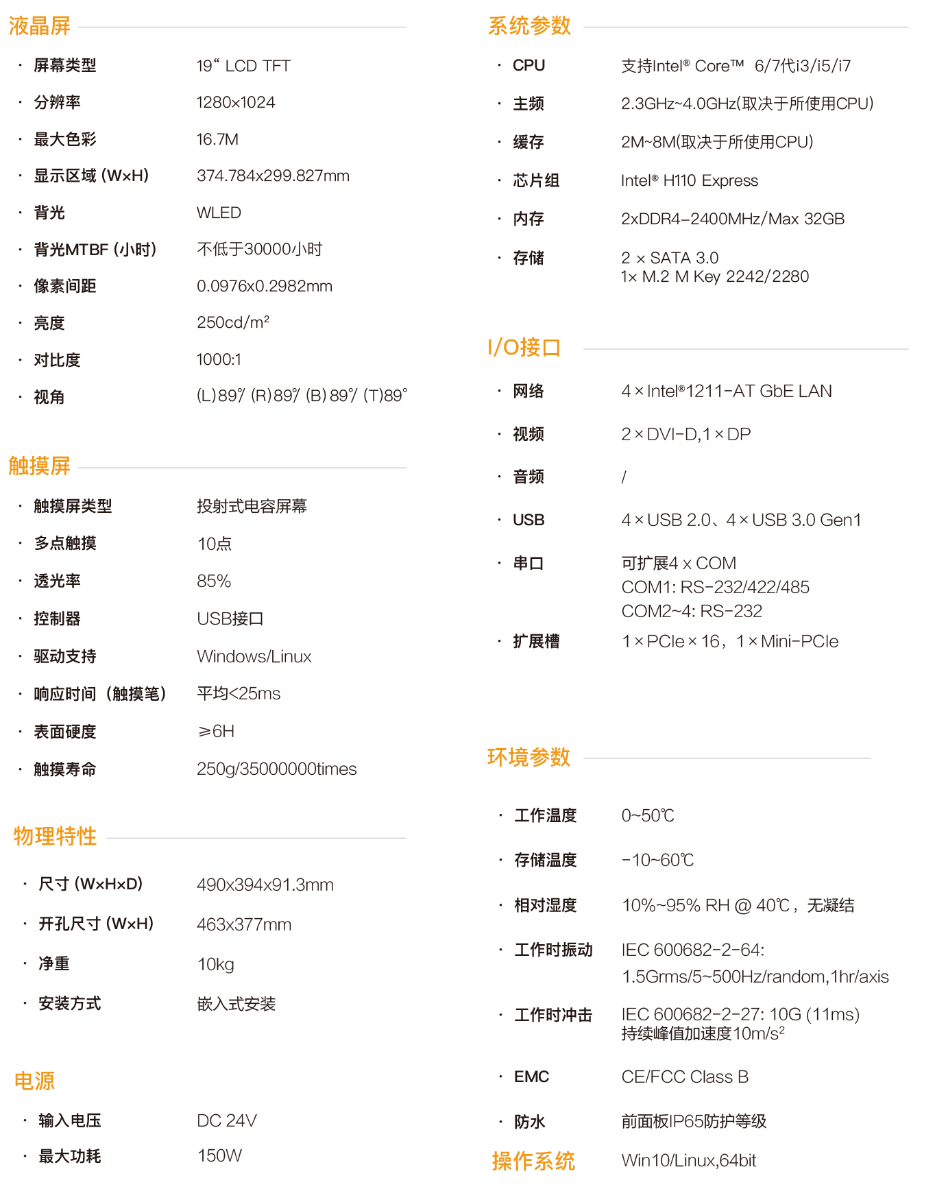 NPC-194i是一款工業(yè)型電容觸控平板電腦,將工業(yè)顯示和觸摸屏技術(shù)相結(jié)合,產(chǎn)品結(jié)構(gòu)緊湊、易于安裝、操控方便,是一款高效能、高可靠的工業(yè)電腦系統(tǒng),整機采用19寸分辨率為1280×1024的高清液晶顯示屏,色彩豐富細膩,視角寬闊,24V直流供電,采用投射式10點電容屏,主機部分搭載Intel Core 6/7代CPU,可配置大容量固態(tài)SSD,內(nèi)存支持最大32G容量。 NPC-194i支持掛鉤式嵌入式安裝,前面板符合IP65防水防塵標準,杜絕安裝在控制柜時因現(xiàn)場飛濺的水滴進入,高強度全鋼型箱體結(jié)構(gòu),具有抗沖擊和振動防護功能,尤其是專門的EMC設(shè)計使得整機具有優(yōu)秀的抗干擾能力,能夠適應(yīng)工業(yè)現(xiàn)場惡劣的工作環(huán)境,廣泛應(yīng)用于工廠自動化、機械制造、數(shù)控設(shè)備、紡織設(shè)備、通訊網(wǎng)絡(luò)以及電力自動化等強干擾的工業(yè)現(xiàn)場。