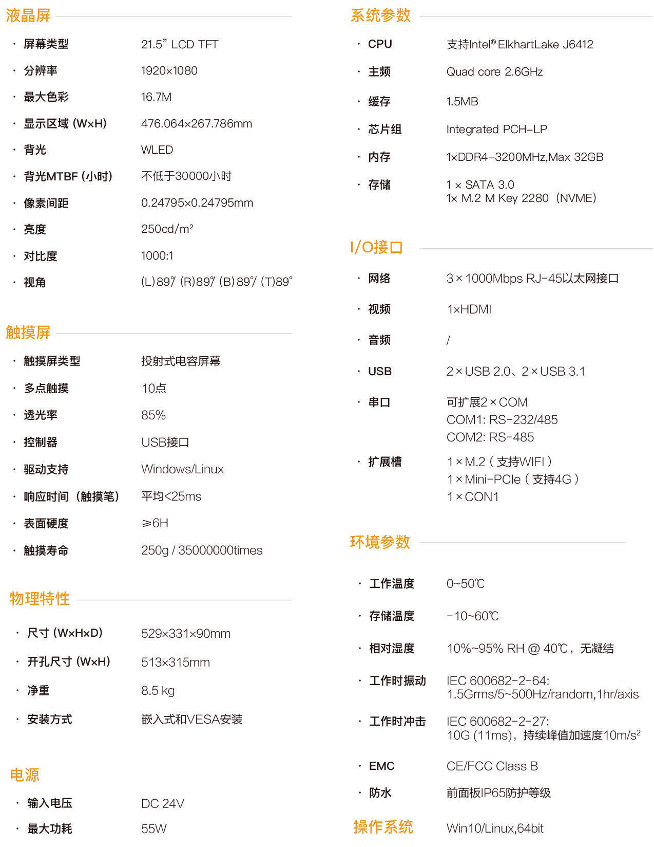 SPC-4722L是一款嵌入式工業(yè)型電容觸控平板電腦,采用 無風扇靜音設(shè)計,將工業(yè)顯示和觸摸屏技術(shù)相結(jié)合,產(chǎn)品構(gòu)成緊 湊、易于安裝、操控方便,是一款高效能、高可靠的工業(yè)電腦系 統(tǒng), 整機采用21.5寸分辨率為1920x1080的高清液晶顯示屏,色 彩豐富細膩,視角寬闊,12~24V寬壓直流供電,觸控采用投射 式電容屏,同時支持10點觸摸,主機部基于Intel ElkhartLake處 理平臺CPU,采用J6412處理器,配置大容量固態(tài)SSD, DDR4 內(nèi)存支持1×32G容量,4×USB接口,3個intel千兆網(wǎng)卡,可擴展2 個COM口,COM1口支持RS232/422/485,COM2口支持 RS232/485,內(nèi)部1個Mini-PCIe擴展插槽可支持4G擴展,1個 M.2用于WIFI擴展,1個HDMI接口用于多顯示器模式。 SPC-4722L支持多種安裝方式:掛鉤式嵌入式安裝,基于 VESA的壁掛式和懸臂式安裝,前面板符合 NEMA/IP65 防水防 塵標準,杜絕安裝在控制柜時因現(xiàn)場飛濺的水滴進入,高強度全 鋼型密封箱體結(jié)構(gòu),具有抗沖擊和振動防護功能,尤其是專門的 EMC設(shè)計使得整機具有優(yōu)秀的抗干擾能力,能夠適應(yīng)工業(yè)現(xiàn)場 惡劣的工作環(huán)境,廣泛應(yīng)用于工廠自動化、機械制造、數(shù)控設(shè)備、 紡織設(shè)備、通訊網(wǎng)絡(luò)以及電力自動化等強干擾工業(yè)場合。